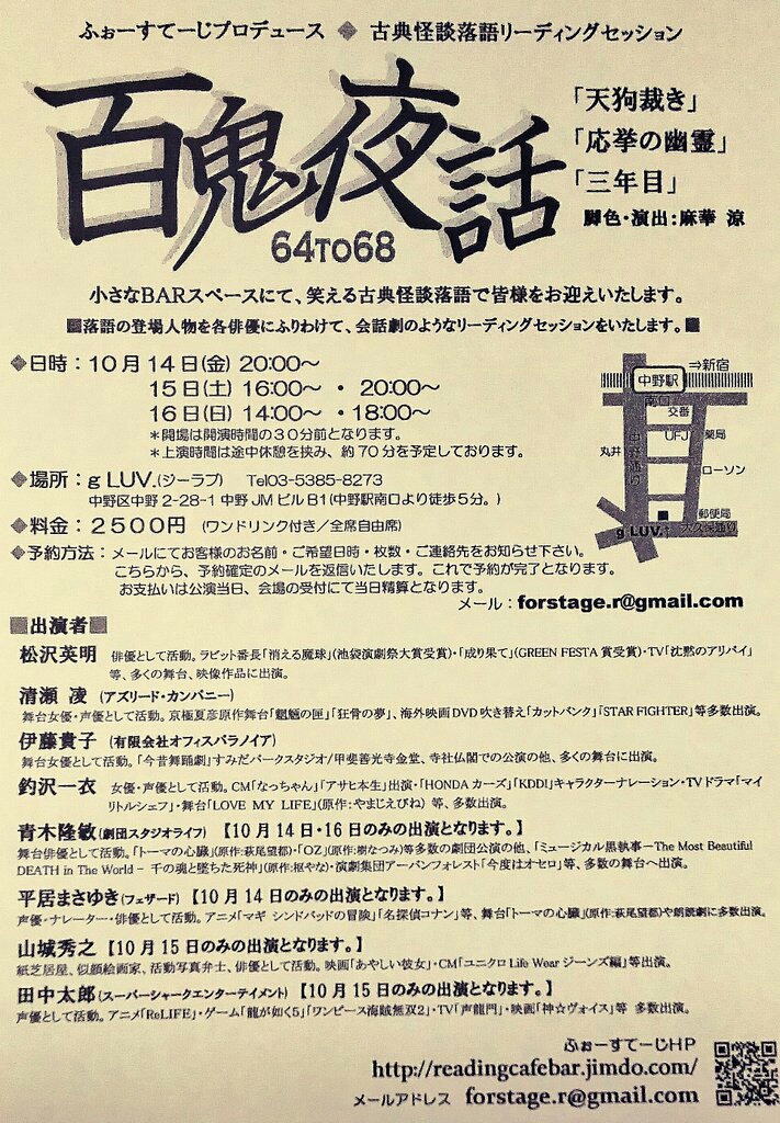 10月14日、古典怪談落語を題材にした朗読公演に出演いたします!